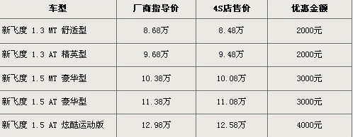 據(jù)廣州本田北京地區(qū)4S店銷售人員介紹,新飛度在售車型分為1.3L及1.5L共5個(gè)車型在售,最低售價(jià)8.48萬元,全系車型優(yōu)惠金額2千-4千不等。目前新飛度銷售火爆,部分車型及顏色需要預(yù)定。北京地區(qū)各4S店由于訂單不同,各店銷售的現(xiàn)車顏色有所不同。