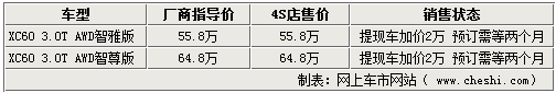 據(jù)沃爾沃汽車4S店銷售人員介紹,XC60目前僅有少量現(xiàn)車到店,但顏色并不齊全。由于目前沃爾沃XC60的現(xiàn)車比較緊張,現(xiàn)在購車仍然需要預(yù)訂,兩個月左右便可以提車,如果消費(fèi)者想要店內(nèi)購買提車的話,需要加價2萬元。