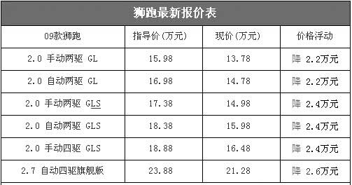 09款獅跑上市后,價(jià)格迅速下降,因此月銷量能夠穩(wěn)定在4000輛左右。我們昨日從北京地區(qū)一家東風(fēng)悅達(dá)起亞獅跑經(jīng)銷商處了解到,近期獅跑部分車型的優(yōu)惠再次增加2000元,最高降幅已經(jīng)增至2.4萬(wàn)元,性價(jià)比再次提升。目前獅跑最低配車型2.0手動(dòng)兩驅(qū)舒適版的售價(jià)為13.78萬(wàn)元,和歷史最低價(jià)持平,和競(jìng)爭(zhēng)對(duì)手途勝售價(jià)非常接近。以下是09款獅跑最新詳細(xì)報(bào)價(jià)表: