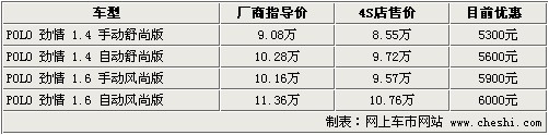 據(jù)4S店銷售人員介紹:目前POLO勁情全系僅為4款車型。之前的1.4升手動擋兩款車型合并為1.4手動舒尚版,1.4升自動擋兩款車同樣合為1.4自動舒尚版。其余1.6升兩款車型不變。目前全系最高優(yōu)惠6000元,其余三款車優(yōu)惠幅度都有所不同。目前全系現(xiàn)車比較少,個別車型僅有1-2臺現(xiàn)車。但目前有在途中車輛,最短等待1周,最長等待2周時間。我們建議購買銀色、藍(lán)色、紅色車款,這3種顏色車型預(yù)定時間短,且店內(nèi)個別車型有此顏色現(xiàn)車。