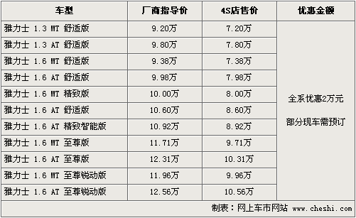 據(jù)廣汽豐田北京地區(qū)4S店銷售人員介紹,現(xiàn)在購買雅力士車型全系優(yōu)惠現(xiàn)金2萬元。目前雅力士1.3車型和1.6舒適、精致均有現(xiàn)車供應(yīng),至尊及銳動(dòng)版現(xiàn)車數(shù)量較少,部分車型需預(yù)訂。現(xiàn)車顏色以黑色、紫色、銀色為主。如消費(fèi)者有意購買,到店詳談會(huì)有更優(yōu)惠的價(jià)格。北京地區(qū)各4S店由于訂單不同,各店銷售的現(xiàn)車顏色有所不同。