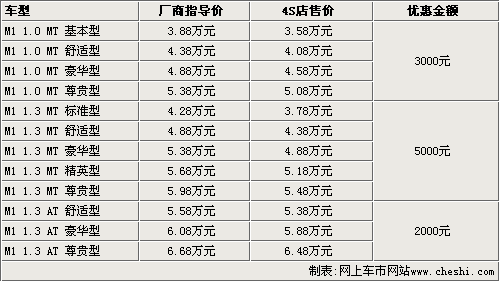 據(jù)瑞麒4S店銷售人員介紹,目前M1 1.0L車型和1.3L手動(dòng)車型現(xiàn)車都比較齊全,其中1.0L車型可以優(yōu)惠3000元,1.3L手動(dòng)擋車型可以優(yōu)惠5000元。另外,該銷售人員介紹,M1 1.3L自動(dòng)擋豪華型已經(jīng)到店,其他車型將在本周抵達(dá)4S店,而且自動(dòng)擋車型現(xiàn)在能優(yōu)惠2000元。