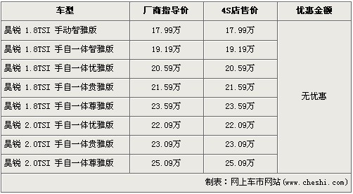 據(jù)北京斯柯達(dá)經(jīng)銷店銷售人員介紹,斯柯達(dá)昊銳共分為8個(gè)車型,售價(jià)區(qū)間為17.99-25.09萬元。目前店內(nèi)昊銳雖然沒有任何優(yōu)惠,但是店內(nèi)的昊銳現(xiàn)車比較充足,消費(fèi)者挑選的空間也較大。