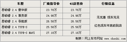 據(jù)東風(fēng)本田4S店銷售人員介紹,目前思鉑睿全系車型無(wú)優(yōu)惠,現(xiàn)車比較充足,現(xiàn)車顏色以白色、銀色、藍(lán)色為主。思鉑睿全系提供了塔夫綢白、彩晶黑、鈦金銀、炫影藍(lán)、炫動(dòng)紫五種外觀顏色,以及靜雅黃、靜逸黑兩種內(nèi)飾顏色供消費(fèi)者選擇。TYPE-S車型還推出炫速紅專用色,在年底前現(xiàn)車將會(huì)到店。北京地區(qū)各4S店由于訂單不同,各店銷售的現(xiàn)車顏色有所不同。
