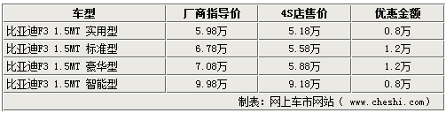 據(jù)比亞迪汽車4S店銷售人員介紹,目前比亞迪F3智能白金版只有實(shí)用型、標(biāo)準(zhǔn)型和豪華型有現(xiàn)車銷售,智能型和自動(dòng)擋車型都現(xiàn)車不足,即使預(yù)訂也無(wú)法得知具體到店時(shí)間,F(xiàn)在購(gòu)買比亞迪F3智能白金版可以有較大的優(yōu)惠幅度,其中標(biāo)準(zhǔn)型,豪華型可以優(yōu)惠12000元;而智能型也可以優(yōu)惠8000元,但需要預(yù)訂。該比亞迪4S店銷售人員表示,如果到店詳談,還可以有更多的優(yōu)惠幅度。
