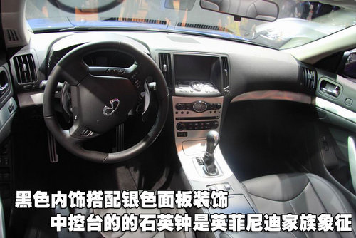 內(nèi)飾的風(fēng)格依然保持了英菲尼度家族式的風(fēng)格,中控臺(tái)中央的石英鐘無(wú)疑就是它典型的的家族特征。黑色內(nèi)飾搭配銀色面板裝飾,沉穩(wěn)中不失活力。