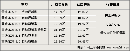 據(jù)東風(fēng)雪鐵龍4S店銷售人員介紹,C5目前已開始接受預(yù)訂,訂金為1萬元,目前陸續(xù)已有客戶開始訂車,最快12月份可以提到現(xiàn)車。C5的展車現(xiàn)已到店,對這款車感興趣的朋友不妨親身去體驗(yàn)一下。