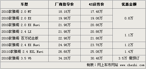 據(jù)廣州本田4S店銷售人員介紹,目前老款雅閣車型已停產(chǎn),銷售車型均為2010款。頂級車型購買可優(yōu)惠3萬元,2.0自動檔標配可優(yōu)惠8千元。現(xiàn)在店內(nèi)現(xiàn)車比較緊張,大部分車型顏色需要預(yù)訂,訂金為2000元。如消費者有意購買,到店詳談會有更優(yōu)惠的價格。北京地區(qū)各4S店由于訂單不同,各店銷售的現(xiàn)車顏色有所不同。
