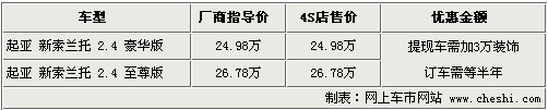 據(jù)進口起亞4S店銷售人員介紹,新索蘭托訂單持續(xù)增加,如客戶著急提車,需在店內(nèi)加裝3萬元裝飾,裝飾包括:腳墊、貼膜、地膠、封釉、加不銹鋼保險杠等。預(yù)訂需要交納1萬元訂金,6月份可提到現(xiàn)車,F(xiàn)車顏色根據(jù)近期到車顏色而定。