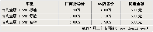 據(jù)北京地區(qū)吉利4S店銷售人員表示,吉利金鷹目前只有1.5L手動(dòng)車型有現(xiàn)車銷售,自動(dòng)版車型則沒有現(xiàn)車,并且不接受預(yù)訂,具體到店時(shí)間目前還不得而知。不過,現(xiàn)在購買吉利金鷹手動(dòng)版車型,全系都可以優(yōu)惠5000元。