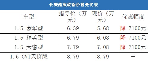 近日,編輯從長城汽車4S經(jīng)銷商處了解到,酷熊前段時間購車送鉆石的促銷活動已經(jīng)結(jié)束,目前在店內(nèi)購車沒有任何優(yōu)惠。相比之下,在綜合經(jīng)銷商處購車的消費者可以享受7100元的現(xiàn)金優(yōu)惠。據(jù)經(jīng)銷商透露,酷熊的CVT版車型也可以預定,定金為2000元,等待15個工作日就可以提車,但是購車沒有任何優(yōu)惠。以下是長城酷熊最新價格變化表: