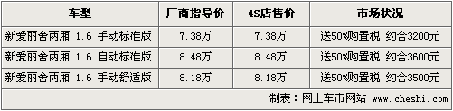 東風(fēng)雪鐵龍愛(ài)麗舍從9月份開始,對(duì)車型進(jìn)行了一次全面升級(jí)。2010款新愛(ài)麗舍在安全、舒適、節(jié)油和性能方面比老款有增加了相應(yīng)的配置,進(jìn)一步強(qiáng)化了新愛(ài)麗舍成熟的產(chǎn)品品質(zhì)。而09款兩廂愛(ài)麗舍更具城市便利性,其備箱空間絲毫不亞于三廂車型,是繼富康后的又一經(jīng)典兩廂叫用車。根據(jù)網(wǎng)上車市價(jià)格監(jiān)測(cè)系統(tǒng)顯示,目前購(gòu)買愛(ài)麗舍兩廂,可享受購(gòu)置稅減半,折合最高優(yōu)惠約3600元。具體車型價(jià)格行情如下: