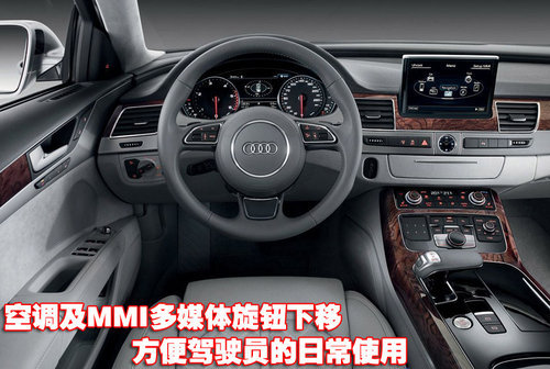 在內(nèi)飾方面,大燈開(kāi)關(guān)、外后視鏡調(diào)節(jié)旋鈕以及電子手剎等大量鍍鉻飾件的應(yīng)用,不僅提升視覺(jué)效果的同時(shí),也進(jìn)一步提升了整車的檔次。此外,中控臺(tái)上的空調(diào)及MMI多媒體影音系統(tǒng)旋鈕均被下移,并與中空臺(tái)形成一定的角度,方便駕駛員的日常使用。
