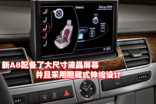 奧迪新A8配備了大尺寸液晶屏幕,并且采用隱藏式伸縮設(shè)計(jì)。除通過(guò)座椅上的按鈕調(diào)節(jié)座椅外,還可以通過(guò)液晶屏幕上的相關(guān)圖示進(jìn)行坐姿選擇。除此之外,中控臺(tái)上的復(fù)古式指針石英表也凸顯了奧迪新A8的華貴。