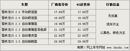 東風(fēng)雪鐵龍C5秉承了雪鐵龍先進(jìn)的創(chuàng)新理念和完美的制造工藝,從外觀到內(nèi)飾的做工充分體現(xiàn)了這款中級(jí)車的內(nèi)在價(jià)值。同時(shí)一系列高端配置以及車身安全性方面均有不俗的表現(xiàn)。根據(jù)網(wǎng)上車市價(jià)格監(jiān)測(cè)系統(tǒng)顯示,目前C5全系都有現(xiàn)車供應(yīng),車價(jià)方面無(wú)任何優(yōu)惠。