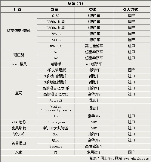 在2010北京國際車展即將開幕之際,我為您奉上W4場館詳細參展品牌及車型介紹,希望通過這篇詳細介紹,讓您在W4館內(nèi)找到自己喜歡的車型,并度過愉快的一天。這次共有9大品牌在W4場館內(nèi)進行參展,其實不乏業(yè)界一線品牌,譬如梅賽德斯奔馳集團、寶馬集團、克萊斯勒集團及沃爾沃等知名品牌。作為一線品牌,它們在亮相車型上也進行了仔細篩選,譬如國內(nèi)知名度較大的E級轎車、全新一代5系Li以及JEEP新大切諾基等車型,這些車型的亮相及發(fā)布,定會引起國內(nèi)消費者的廣泛關(guān)注。