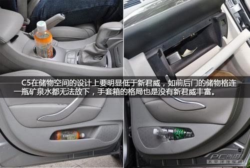 車內(nèi)儲物空間我們用的是“飲料瓶”來衡量看看究竟那款車更人性,新君威車內(nèi)的儲物空間設(shè)計相當(dāng)人性化,前后側(cè)門的儲物格能放進(jìn)去飲料瓶,手套箱的儲物格局也是很豐富,排擋前方預(yù)留了2個飲料瓶的儲物槽,但是中控臺上方對于票據(jù)、錢包、手機(jī)等雜物空間設(shè)計就沒有C5那么人性。