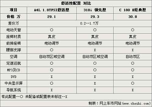 為了讓駕駛變得更輕松讓旅程變得更愜意,高端轎車一般都會具備較為全面的舒適娛樂設(shè)施。這三款車型基本上都是車系的入門產(chǎn)品,因此在配置上豪華型有所欠佳,實用性上也全部沒有配備GPS導(dǎo)航系統(tǒng)和DVD播放功能。不過3款車型均把一觸式防夾車窗、4門一觸式車窗、CD機(jī)作為了標(biāo)準(zhǔn)配備,進(jìn)一步豐富了整車的功能性和娛樂性。其中奧迪A4L還提供了中央顯示屏以及雙區(qū)域的自動恒溫空調(diào),應(yīng)該說是更為細(xì)致入微的。