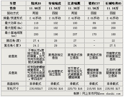 首先,作為一款SUV,人們除了關(guān)注他們的基本信息外,更看重的就是它實(shí)際的通過(guò)性和操控性。通過(guò)上表我們可以看到,除了獵豹CS7,其他4款車型的離地間隙都處于一個(gè)比較優(yōu)秀的水平上,這為人們?nèi)粘3鲂薪加,順利通過(guò)略微惡略的路況提供了保障。另外,值得一提的就是5款SUV的底盤結(jié)構(gòu),瑞虎、瑞鷹和CS7三款都采用了中規(guī)中矩的承載式設(shè)計(jì),而陸風(fēng)X8和哈弗H5則采用了純正的越野車底盤設(shè)計(jì)-非承載式,讓車輛在越野路況也可以更順暢的通過(guò)。