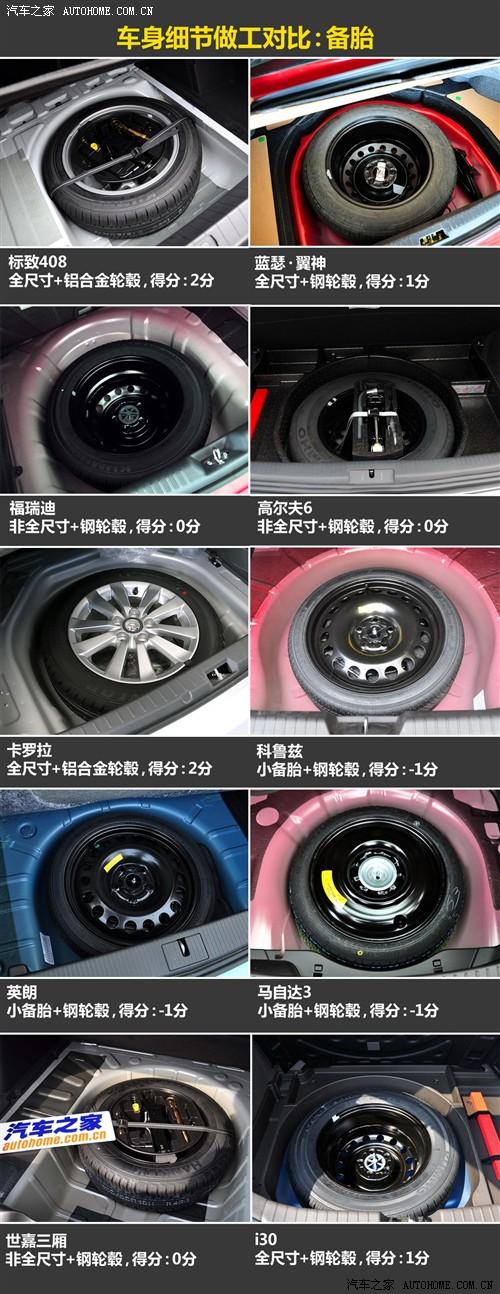 在這一環(huán)節(jié)的對比中,只有標致408和卡羅拉使用了難得一見的鋁合金輪轂,其實408的低配車型使用的也是鋼輪轂。其他大部分車型都是鋼輪轂和非全尺寸備胎,其中值得商榷的就是福瑞迪,他全系都是195mm或者205mm的輪胎,但備胎卻都是185mm,原因當然是為了節(jié)約成本。同時,科魯茲、英朗和馬自達3兩廂使用的小備胎對于使用有一定的影響,我們必須扣分。