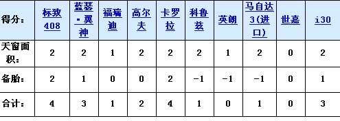 在天窗和備胎的對比中,得分最高的是408和卡羅拉,因為他們都具有很大的天窗和鋁合金輪轂的全尺寸備胎,而得分最低的英朗則主要是因為備胎扣分,世嘉則是因為沒有天窗,備胎也沒有任何特點。