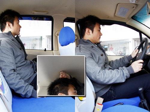 樂馳的車內空間感覺上很狹小,就連前排乘坐空間也是如此,上圖中空間展示者身高175cm左右,如此身高已經前后接近于車內頂棚,對于空間展示者來說,前、后的頭部空間,也只有一拳左右的富余量。
