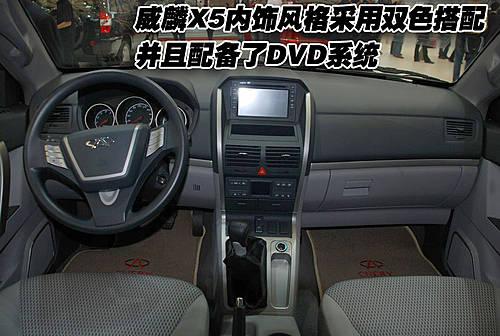 威麟X5不僅外觀非常兇悍,內(nèi)飾的風(fēng)格同樣比較硬朗。在內(nèi)飾顏色布局方面,這款車采用雙色調(diào)設(shè)計(jì),整車的內(nèi)部機(jī)構(gòu)設(shè)計(jì)都與奇瑞其他車型有不同的感覺(jué)。