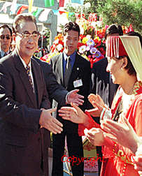 全國人大常委會(huì)委員長(zhǎng)李鵬(左)十月二日在中山公園參加國慶五十周年游園活動(dòng) 時(shí),與少數(shù)民族代表親切握手。