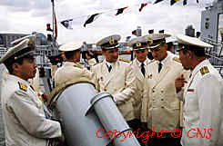 在上海訪問的俄羅斯海軍艦艇編隊官兵,十月四日在中國海軍揚子江碼頭參觀中國新型的海軍導(dǎo)彈驅(qū)逐艦和護衛(wèi)艦。