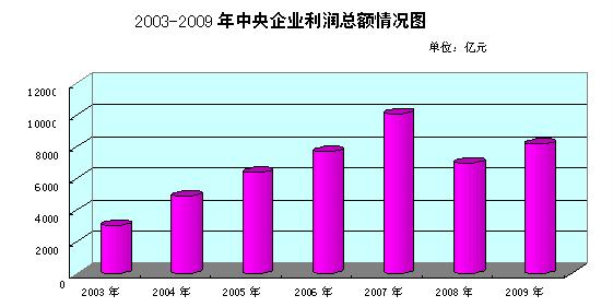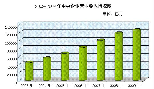 二、經(jīng)營(yíng)規(guī)模情況。截至2009年底,中央企業(yè)資產(chǎn)總額210580.8億元,比上年增長(zhǎng)19.5%;凈資產(chǎn)總額83968.9億元,比上年增長(zhǎng)14.6%。2009年中央企業(yè)實(shí)現(xiàn)營(yíng)業(yè)總收入126271.6億元,比上年增長(zhǎng)6.4%。在全部中央企業(yè)中,2009年底資產(chǎn)總額超過(guò)千億元的企業(yè)有53家,比上年增加8家;2009年實(shí)現(xiàn)營(yíng)業(yè)總收入超過(guò)千億元的企業(yè)有38家,比上年增加5家。在美國(guó)《財(cái)富》雜志2010年公布的世界500強(qiáng)企業(yè)中,上榜的中央企業(yè)有30家,比上年增加6家,比2003年增加24家!