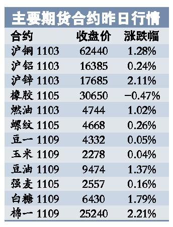 截至收盤,鋅和棉花期貨漲幅都超過(guò)2%;銅、燃油、豆油白糖等品種漲幅超過(guò)1%,這在近期連續(xù)下跌的行情中頗為少見(jiàn)。
