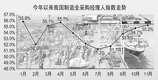 中國(guó)物流與采購(gòu)聯(lián)合會(huì)1日發(fā)布數(shù)據(jù),11月中國(guó)制造業(yè)采購(gòu)經(jīng)理指數(shù)PMI為55.2%,創(chuàng)近7個(gè)月來(lái)新高,環(huán)比上升0.5個(gè)百分點(diǎn)。自8月份以來(lái),PMI指數(shù)連續(xù)4個(gè)月回升。