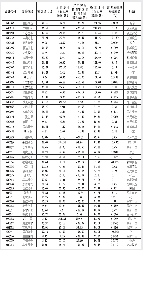 據(jù)中國證券報(bào)信息數(shù)據(jù)中心統(tǒng)計(jì),這73只股票可分為兩類。一類是先抑后揚(yáng),自2007年10月16日至2008年11月4日,有50只股票隨大盤下跌出現(xiàn)同步調(diào)整。跌幅超過20%的股票有32只。而這些股票自2008年11月5日以來表現(xiàn)活躍,有12只股票漲幅超過100%、18只股票漲幅在50%-100%之間,2只股票漲幅在30%-50%之間。