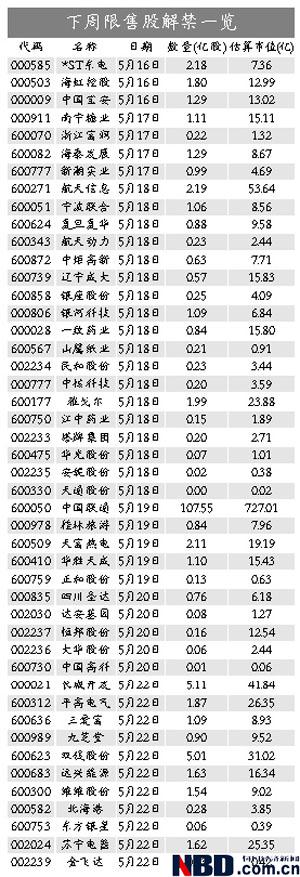 市場(chǎng)人士認(rèn)為,下周限售股解禁壓力集中在中小板的 “大小限”和有增發(fā)限售股解禁上市的這類公司上,而股改限售股的壓力較小。