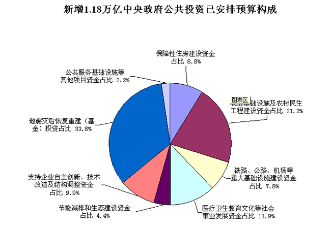 截至目前,1.18萬(wàn)億元新增中央政府公共投資已安排資金5915億元,分項(xiàng)目情況如下:用于保障性住房建設(shè)資金522億元,占8.8%;農(nóng)業(yè)基礎(chǔ)設(shè)施及農(nóng)村民生工程建設(shè)資金1253億元,占21.2%;鐵路、公路、機(jī)場(chǎng)等重大基礎(chǔ)設(shè)施建設(shè)資金460億元,占7.8%;醫(yī)療衛(wèi)生教育文化等社會(huì)事業(yè)發(fā)展資金703億元,占11.9%;節(jié)能減排和生態(tài)建設(shè)資金260億元,占4.4%;支持企業(yè)自主創(chuàng)新、技術(shù)改造及結(jié)構(gòu)調(diào)整資金585億元,占9.9%;地震災(zāi)后恢復(fù)重建(基金)投資2000億元,占33.8%;公共服務(wù)基礎(chǔ)設(shè)施等其他項(xiàng)目資金132億元,占2.2%。