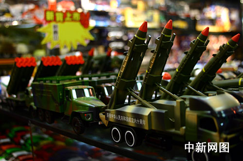 而在國際商貿(mào)城二期的旅游購物中心一家玩具商鋪,“移動加榴炮發(fā)射車”、“洲際導(dǎo)彈發(fā)射車”、“后勤保障車”等曾在閱兵式上“亮相”的軍事武器玩具模型,一個方陣一個方陣地排列著,接受著市場的“大閱兵”。