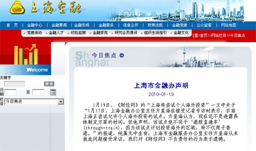 據(jù)上海金融辦網(wǎng)站刊出的聲明指出,《財(cái)經(jīng)網(wǎng)》有關(guān)“上海將嘗試個(gè)人海外投資”的報(bào)道,純屬“無中生有”,上海市金融服務(wù)辦公室主任方星海,從未就此問題接受采訪,對(duì)《財(cái)經(jīng)網(wǎng)》不負(fù)責(zé)任的行為,表示遺憾。