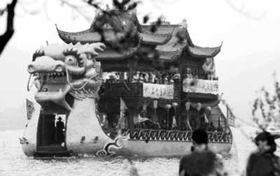 其實,早在1986年,樓外樓飯店就推出了一艘餐飲船,一直?吭跇峭鈽情T前的碼頭。據(jù)樓外樓副總經(jīng)理蔣紅介紹,飯店去年投資近600萬元又推出了一艘“樓外樓號”畫舫,船體金碧輝煌,可供50人游湖、20人用餐。