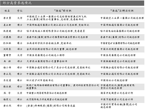 2008年7月8日,國(guó)資委發(fā)布消息,將面向海內(nèi)外公開(kāi)招聘16名央企高管,這已是國(guó)資委第6年公開(kāi)招聘央企領(lǐng)導(dǎo)。據(jù)統(tǒng)計(jì),前5年,通過(guò)這種方式一共招聘了91名高管。那么,這些高管現(xiàn)狀如何,這種“海選”的方式是否科學(xué)有效?