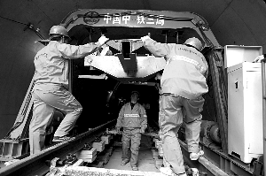 “目前的鋪軌技術(shù)是國(guó)內(nèi)最先進(jìn)的,25米的鋼軌在地面形成軌排,然后機(jī)械下到地下進(jìn)行鋪裝!敝需F一局軌道項(xiàng)目經(jīng)理表示,目前一個(gè)基地每天的鋪軌進(jìn)度是150米!28公里的軌道線上,8.5公里路段采用了減震處理!痹撠(fù)責(zé)人表示,4號(hào)線是北京減震處理最多的一條地鐵。