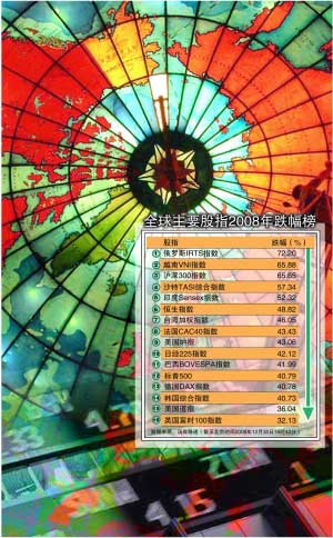 發(fā)達(dá)經(jīng)濟(jì)體如此,以往一直以“免疫力”強(qiáng)著稱(chēng)的新興市場(chǎng)也未能幸免。其中,受到油價(jià)下跌和金融危機(jī)雙重打擊的俄羅斯股市全年跌幅超過(guò)70%,高居全球之首!敖鸫u四國(guó)”中的另外三國(guó)——中國(guó)、印度和巴西,股市全年跌幅都超過(guò)40%甚至高達(dá)60%。