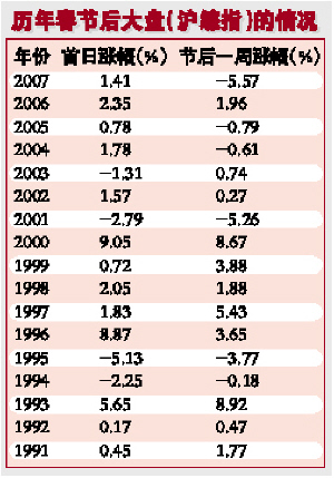統(tǒng)計還顯示,從1991年春節(jié)以來的17年中,只有4年春節(jié)后首個交易日市場沒有“開門紅”,分別是1994年、1995年、2001年、2003年。另外有13年,春節(jié)后首個交易日大盤均出現(xiàn)不同程度的上漲,占統(tǒng)計樣本的近80%。(見表)