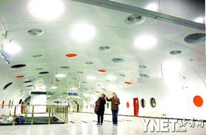 “太空艙”———這是記者對(duì)“金臺(tái)夕照”站廳裝修的直接印象。寬闊站廳內(nèi),兩側(cè)墻壁如括號(hào)般向內(nèi)彎曲形成類(lèi)似機(jī)艙的形狀。除了地面之外,無(wú)論墻壁還是天花板,圓形白光燈池和橘紅色色塊如密集的氣泡一樣分布,大的直徑可達(dá)1米,小的直徑才20厘米左右。面對(duì)如此現(xiàn)代風(fēng)格的設(shè)計(jì),“金臺(tái)夕照”仿佛被賦予了新的生命。