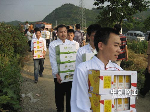 結(jié)合實(shí)際情況,從伊利邛崍工廠劉志亮帶來的救援人員和綿陽云永剛組織的人員 20人,加上一些在當(dāng)?shù)氐闹驹刚撸医M織了幾十個(gè)人隊(duì)伍,決定把牛奶靠人力搬進(jìn)去,搬去體育場(chǎng),并發(fā)給災(zāi)民。晚上看他們拍的照片,發(fā)現(xiàn)真是一支浩浩蕩蕩的搬牛奶的隊(duì)伍。