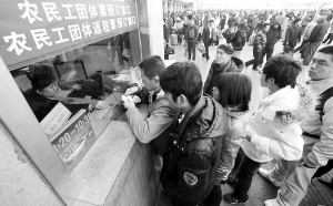晨報(bào)訊(記者 張碩)昨天,北京站、北京西站開始銷售農(nóng)民工火車票,并且接受農(nóng)民工團(tuán)體票的預(yù)訂。這次還開設(shè)了農(nóng)民工返程團(tuán)體票的預(yù)訂和發(fā)售,大大方便了在京農(nóng)民工。據(jù)悉,1月6日至15日為民工流高峰。