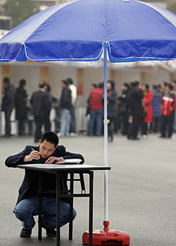 記者根據指點到達這個距離六里橋長途汽車站不遠的非法勞務市場一條街時,已經有300多名農民工聚集在馬路北邊能曬到太陽的街道旁。