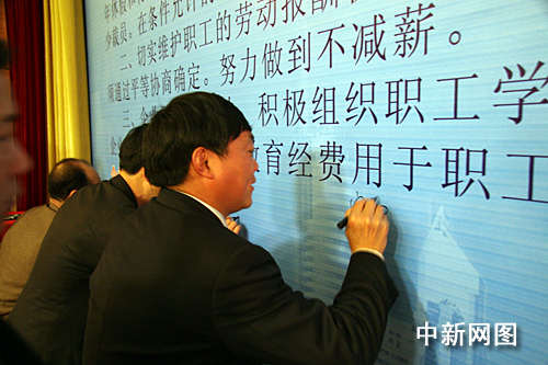 記者在現(xiàn)場看到,《共同約定書》中企業(yè)方的承諾主要是:企業(yè)依法采取縮短工時,適時安排年休假和特別休假、輪崗輪休等形式保障職工崗位,做到不減薪、不裁員或少裁員。企業(yè)要組織職工學習新技術,而且企業(yè)教育經(jīng)費用于職工培訓不少于70%。另一方面,職工方作出了立足本職、愛崗敬業(yè)、積極為企業(yè)發(fā)展獻計出力等承諾。