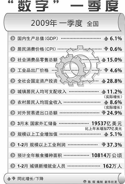 與上年同期比,一季度GDP6.1%的增長(zhǎng)幅度回落了4.5個(gè)百分點(diǎn),雖然不是個(gè)漂亮的數(shù)字,但放在金融危機(jī)的大背景下看,各個(gè)方面都會(huì)承認(rèn)這是一個(gè)來之不易、好于預(yù)期的增長(zhǎng)速度。細(xì)讀統(tǒng)計(jì)數(shù)據(jù)的8個(gè)部分,國(guó)民經(jīng)濟(jì)運(yùn)行的積極變化顯而易見。國(guó)家統(tǒng)計(jì)局新聞發(fā)言人李曉超用兩個(gè)“穩(wěn)”、兩個(gè)“快”、三個(gè)“高”和三個(gè)“縮小”,來概括這種積極變化的幾個(gè)方面。