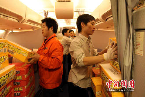 此次運(yùn)輸貨物的飛機(jī)是沒(méi)有旅客的客機(jī),因?yàn)槲鲗師o(wú)法降落大型貨機(jī),南航只能以 客機(jī)載貨。該批物資是廣東省府捐贈(zèng)給玉樹(shù)地震災(zāi)區(qū)的餅干、快食面等食品,共90357箱,總重量為38噸。因?yàn)轱w機(jī)容量有限,該批物資分兩批承運(yùn),當(dāng)晚首批裝載20.81噸。
