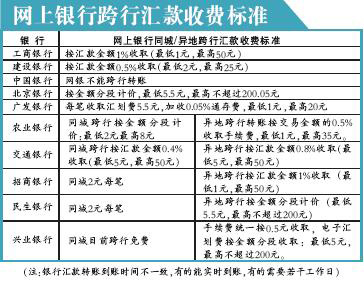 工行規(guī)定,網(wǎng)上銀行跨行轉(zhuǎn)賬收費比例是轉(zhuǎn)賬金額的1%,最低1元,最高為50元;招行規(guī)定網(wǎng)銀同城跨行轉(zhuǎn)賬是2元每筆,異地跨行轉(zhuǎn)賬收費比例也是1%,最低10元,最高50元。而建行的規(guī)定則是0.5%,最低2元,最高25元。交行則規(guī)定跨行轉(zhuǎn)賬費用的比例是0.4%,最低5元,最高是50元。廣發(fā)銀行對個人網(wǎng)銀跨行轉(zhuǎn)賬每筆收取匯劃費5.5元,加收0.05%的通存費,最低1元,最高20元。